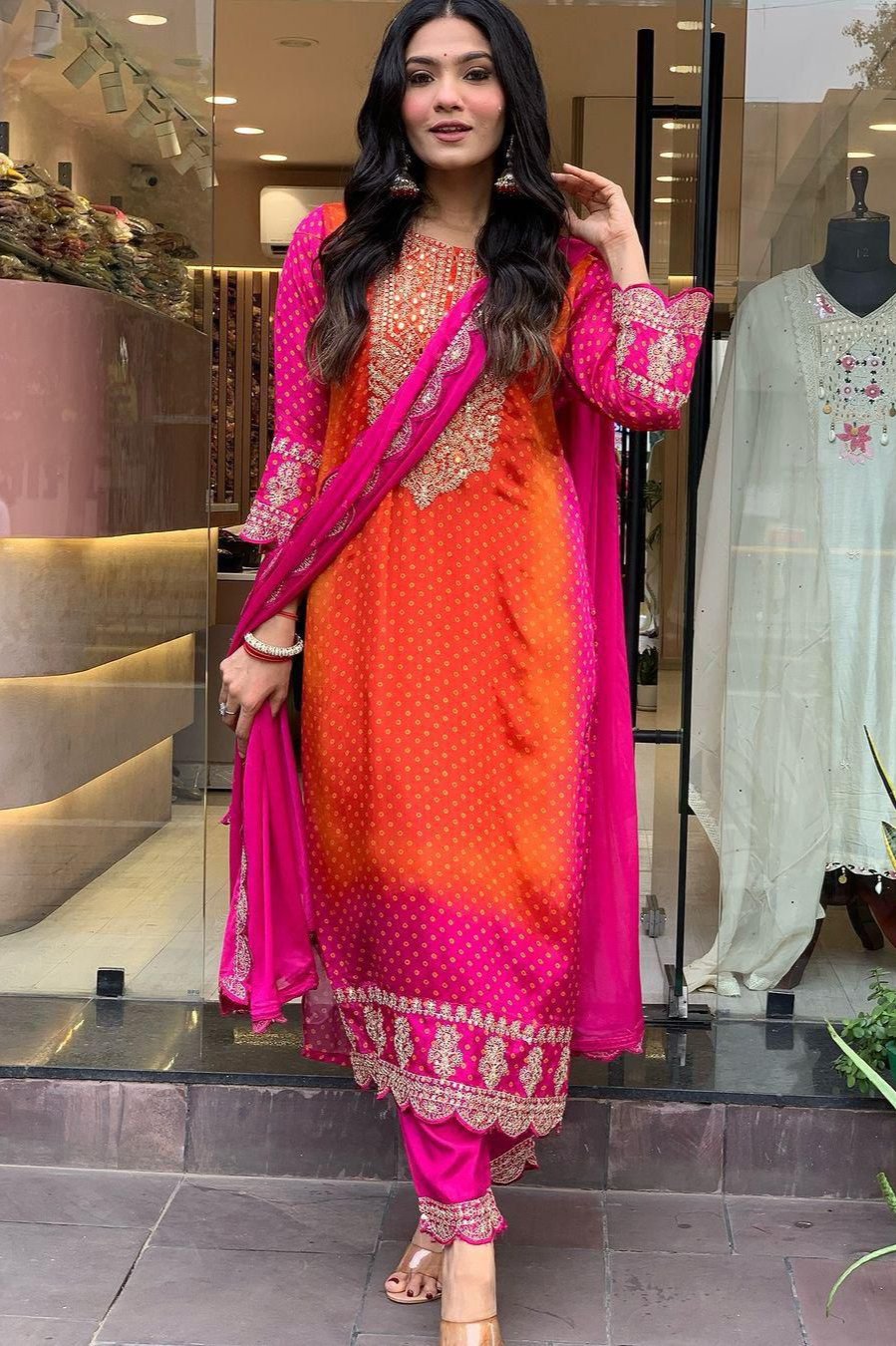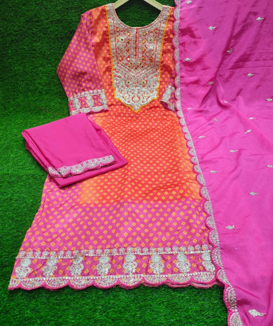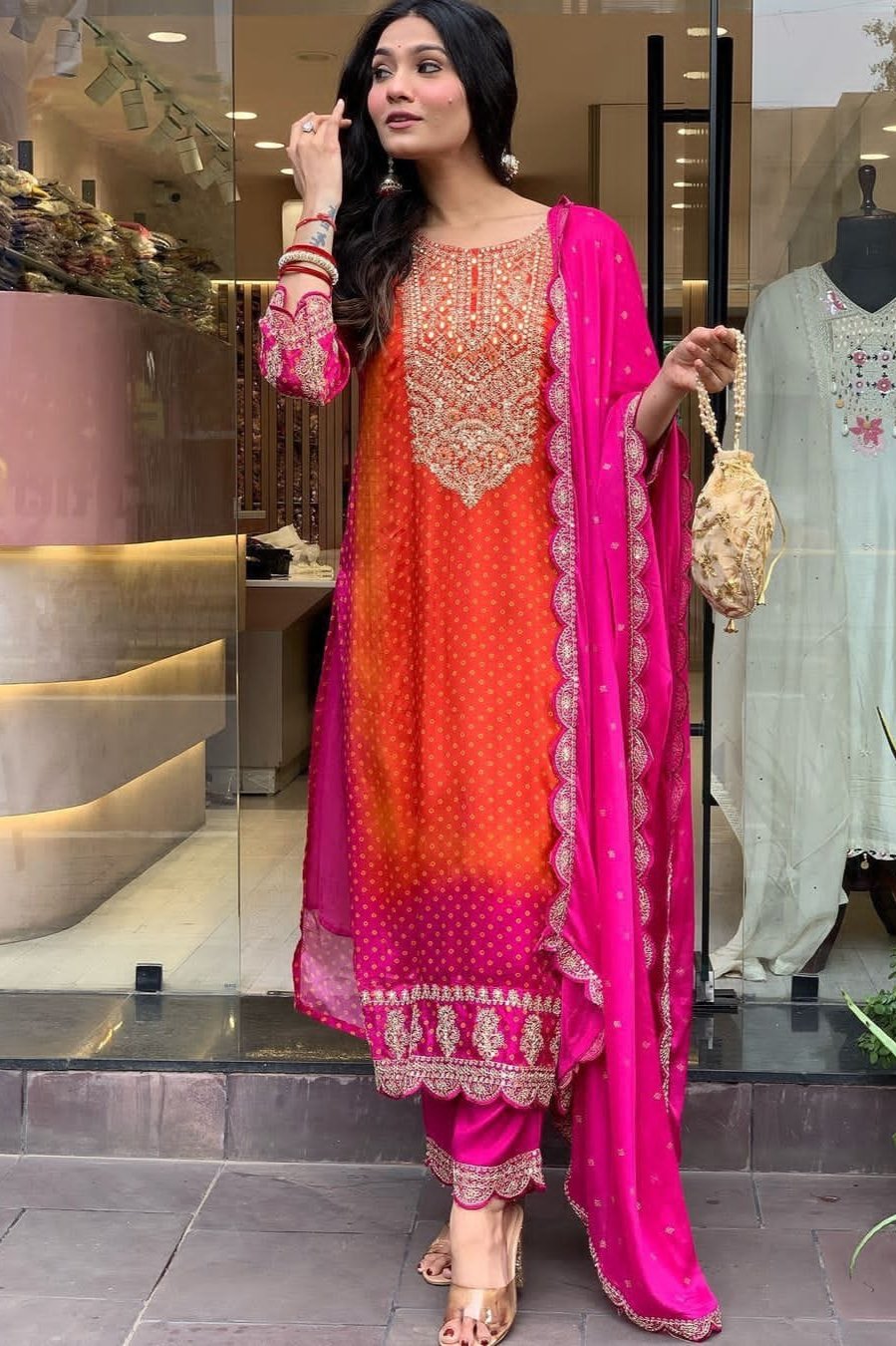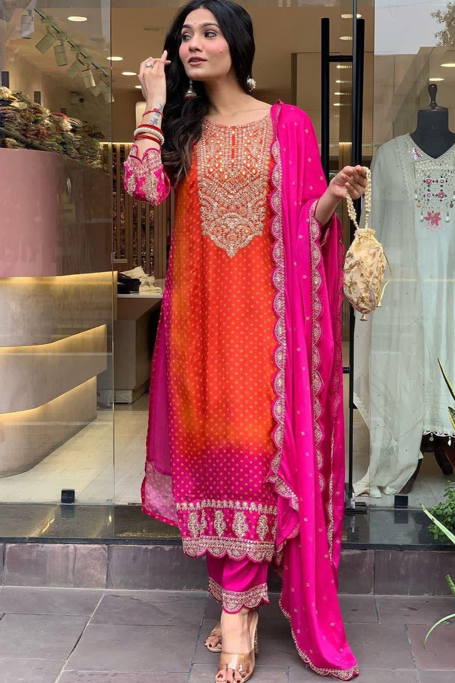 Introducing the Pink Chinon Silk Embroidered Festive Set, a statement ensemble designed to elevate your festive wardrobe. Made from premium-quality Chinon Silk fabric, this set features a rich texture and a soft sheen that exudes luxury. The kurti, adorned with exquisite embroidery and glimmering sequin work, is a testament to fine craftsmanship. A comfortable lining ensures that you stay at ease without compromising on style. The straight-fit pants offer a contemporary edge while maintaining traditional charm, making it perfect for dancing through joyous occasions.