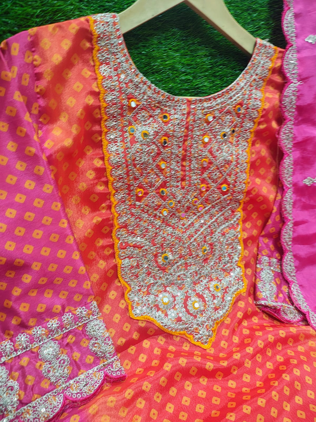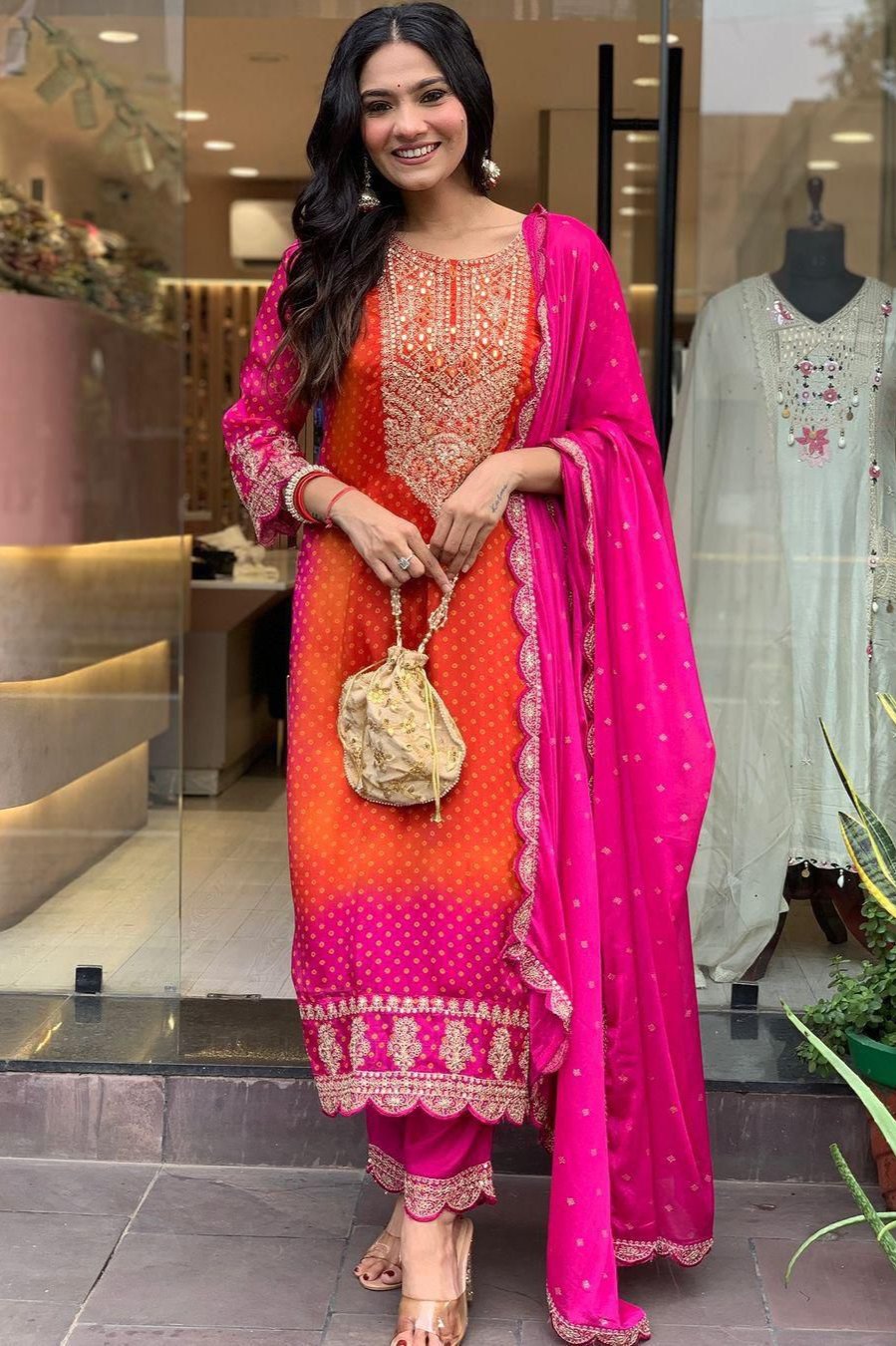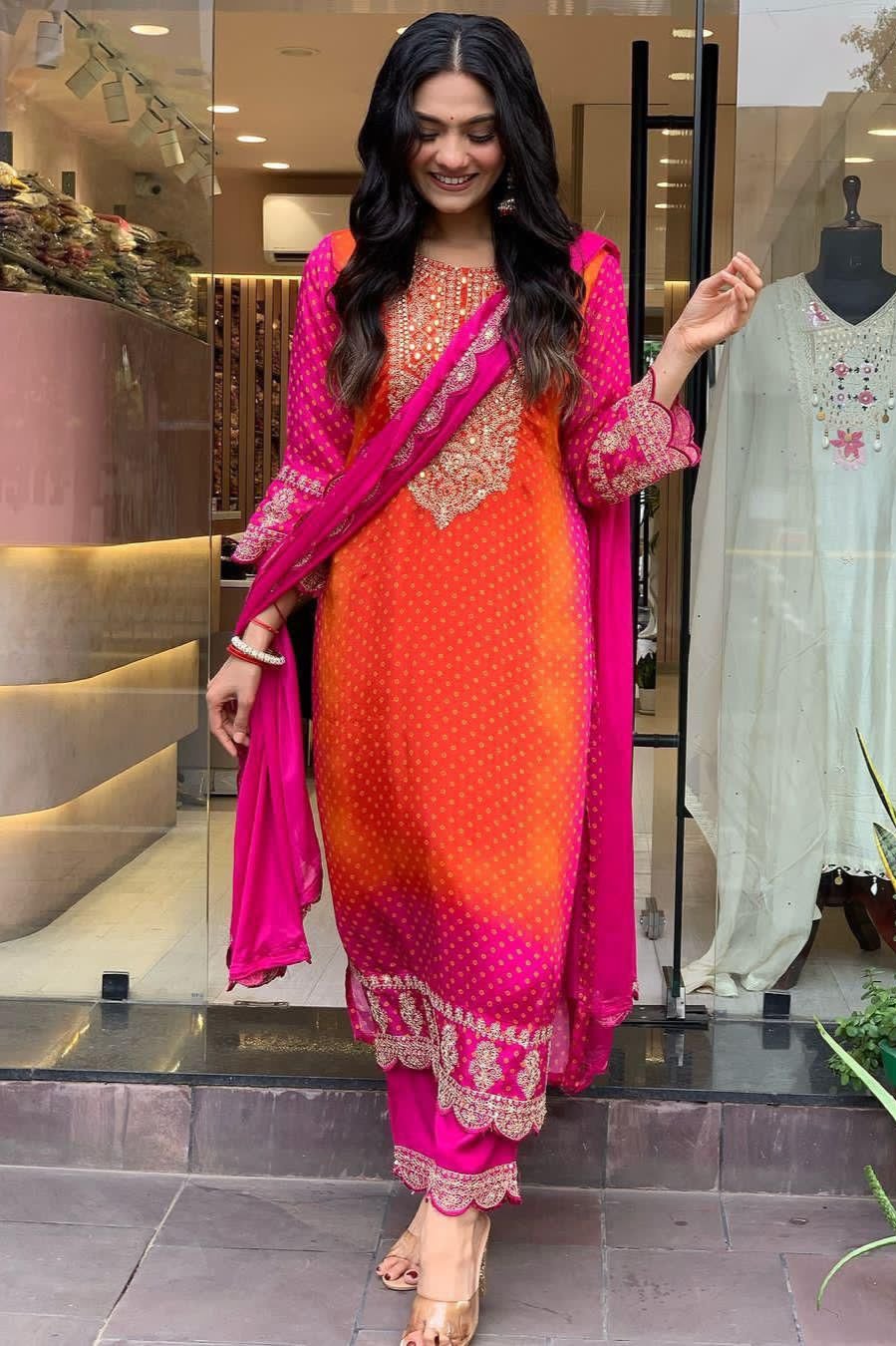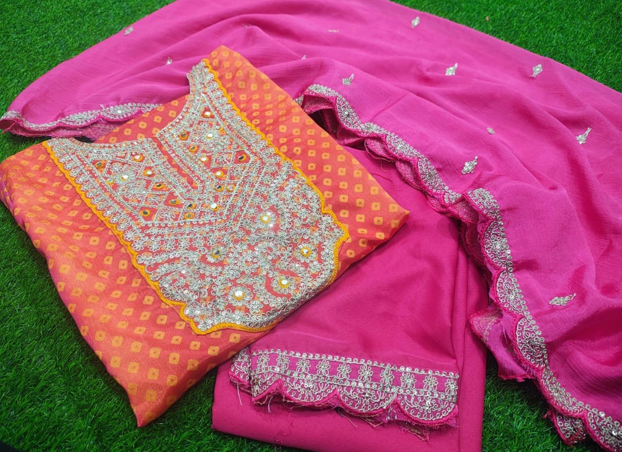 Introducing the Pink Chinon Silk Embroidered Festive Set, a statement ensemble designed to elevate your festive wardrobe. Made from premium-quality Chinon Silk fabric, this set features a rich texture and a soft sheen that exudes luxury. The kurti, adorned with exquisite embroidery and glimmering sequin work, is a testament to fine craftsmanship. A comfortable lining ensures that you stay at ease without compromising on style. The straight-fit pants offer a contemporary edge while maintaining traditional charm, making it perfect for dancing through joyous occasions.
