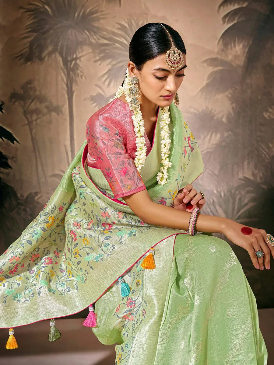 This designer Pristine Pista Green Paithani Banarasi Silk Saree is crafted with high-quality Munga silk and intricately woven with resham in floral motifs. The saree also features delicate tassels and zari work, adding a beautiful touch. Complete with a fancy contrast blouse, this saree is perfect for traditional occasions.