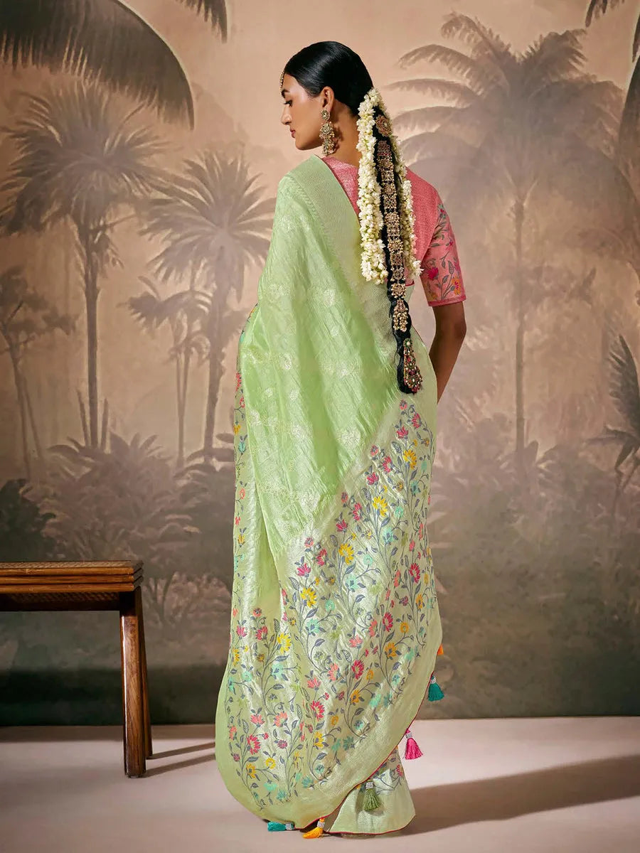Pristine Pista Green Paithani Banarasi Silk Saree with Floral Motifs