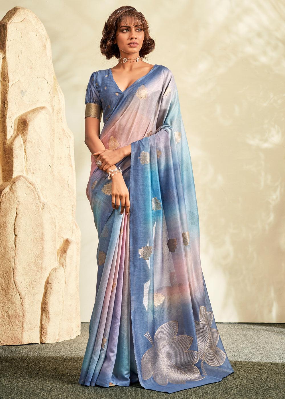 River Blue Digital Printed Textured Silk Saree