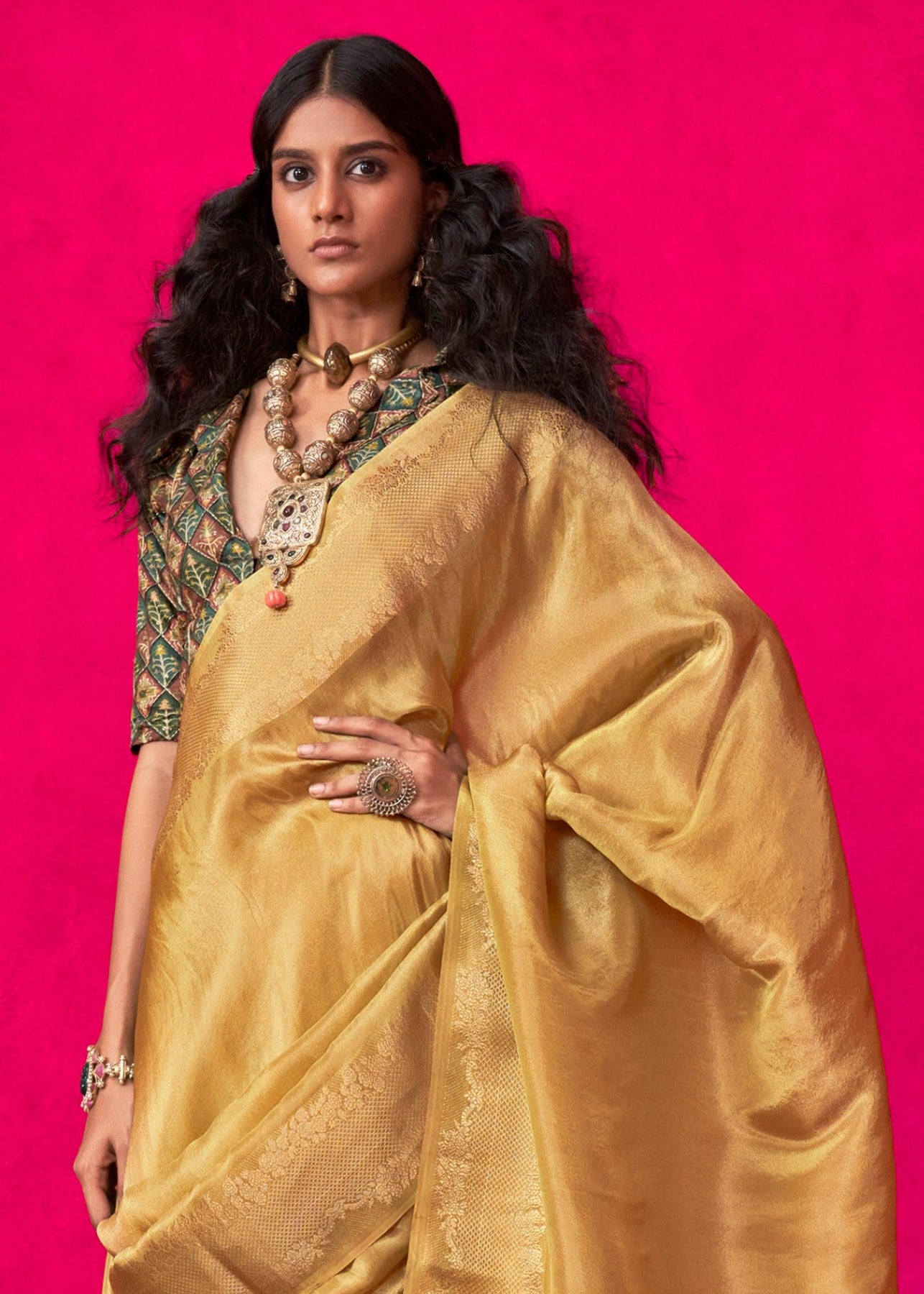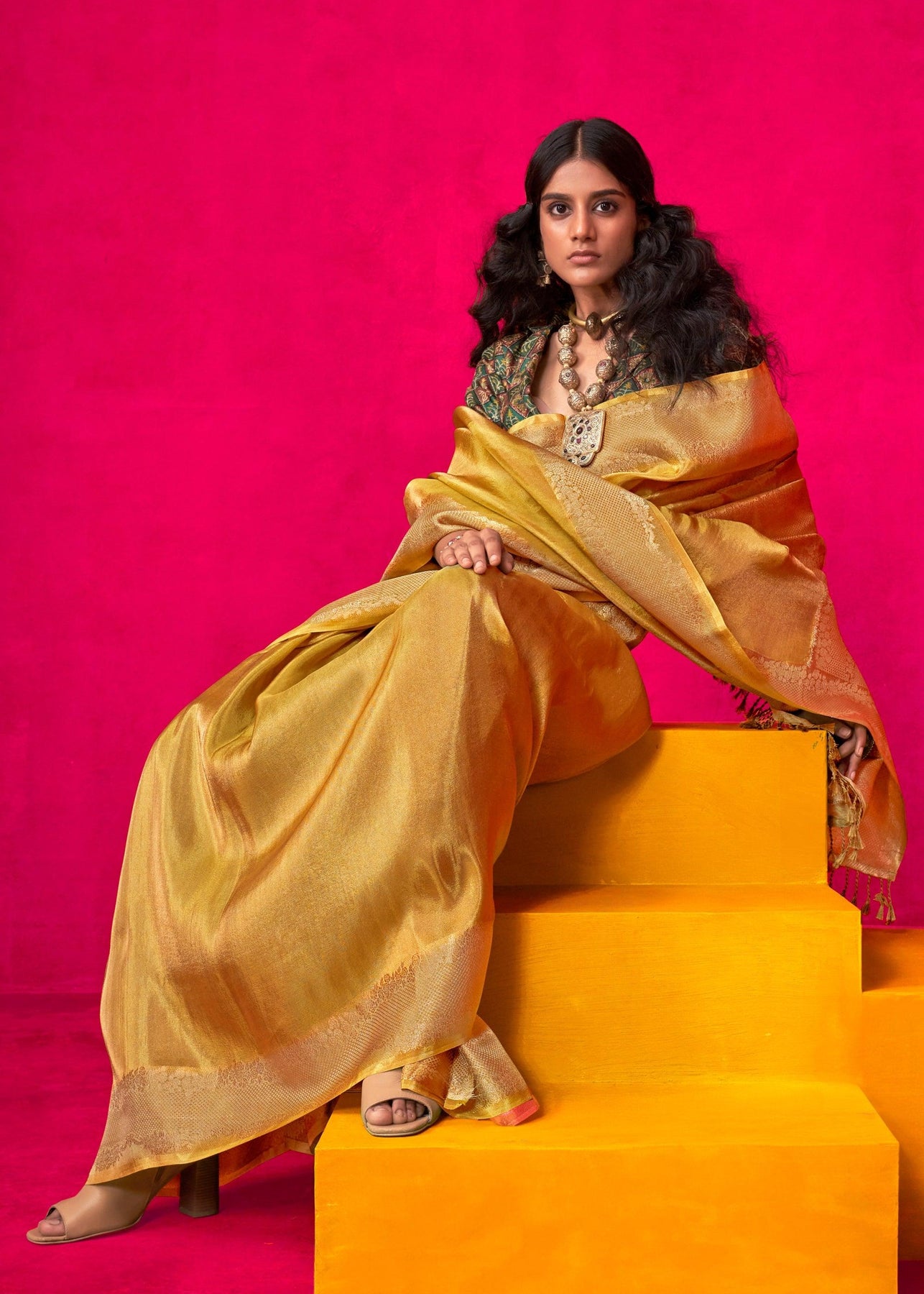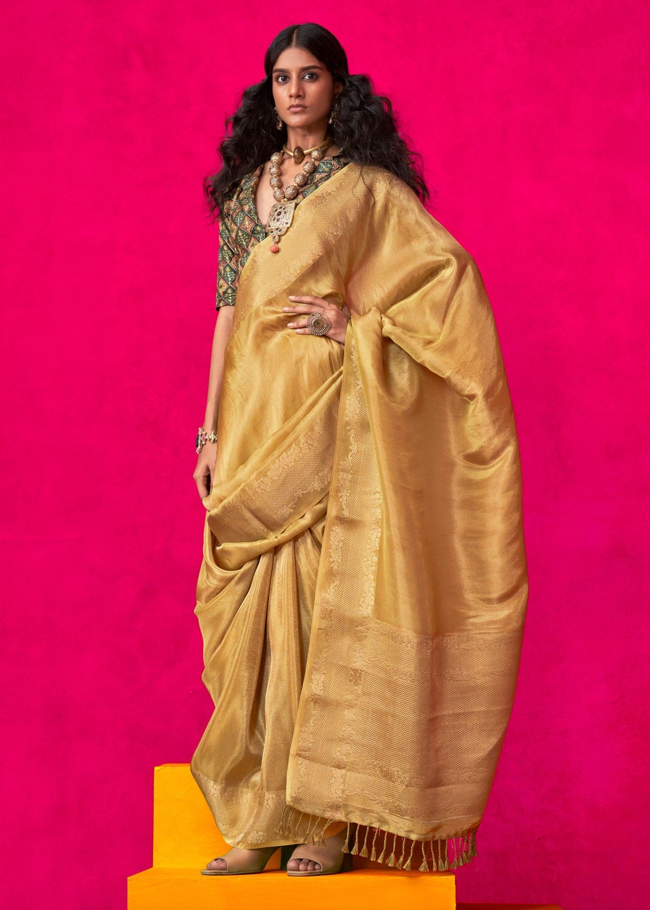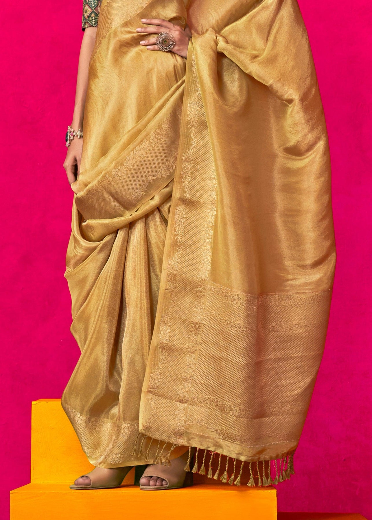 Royal Golden Woven Banarasi Tissue Silk Saree With Contrast Blouse