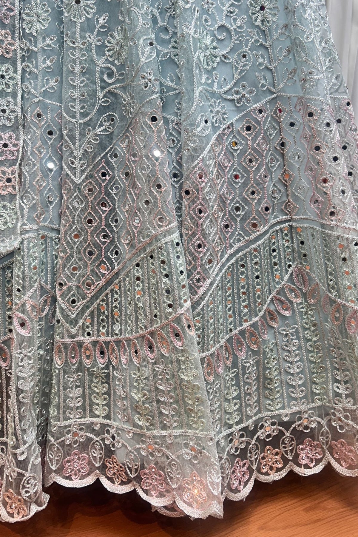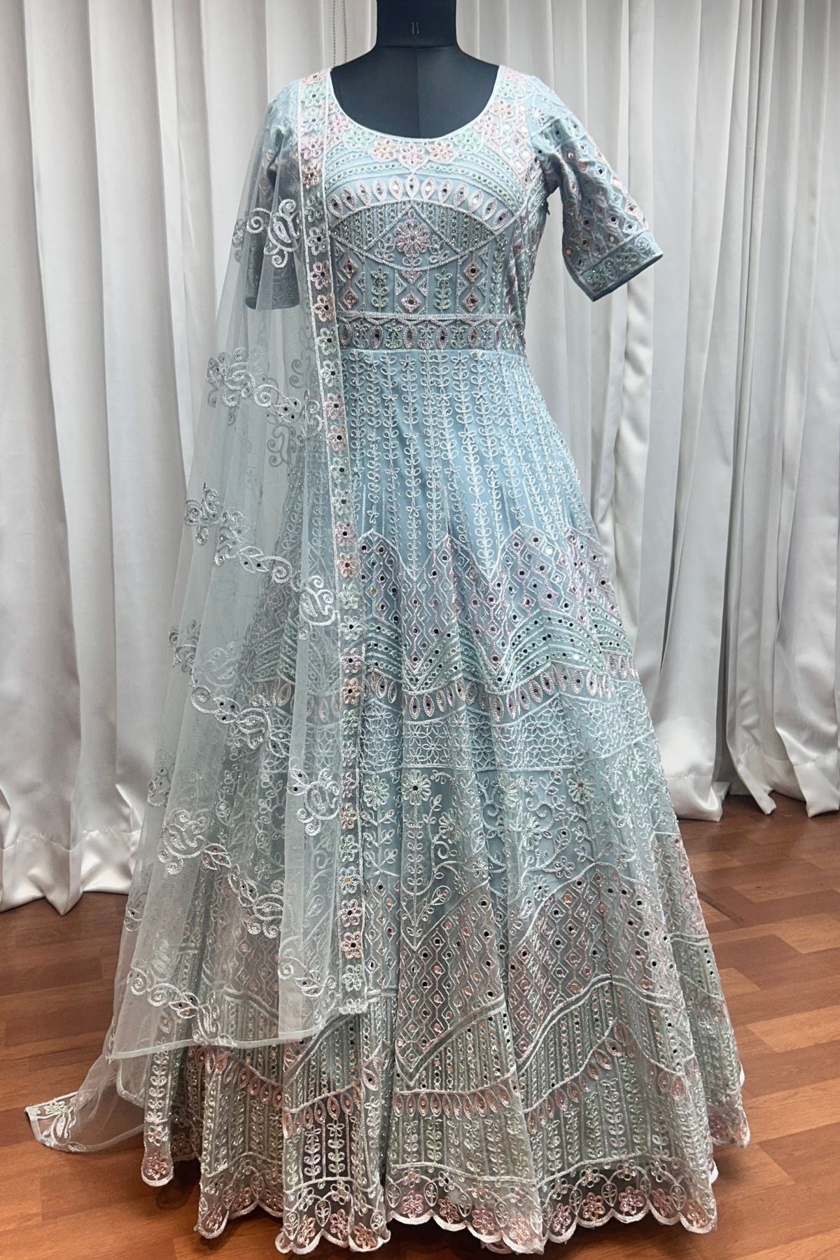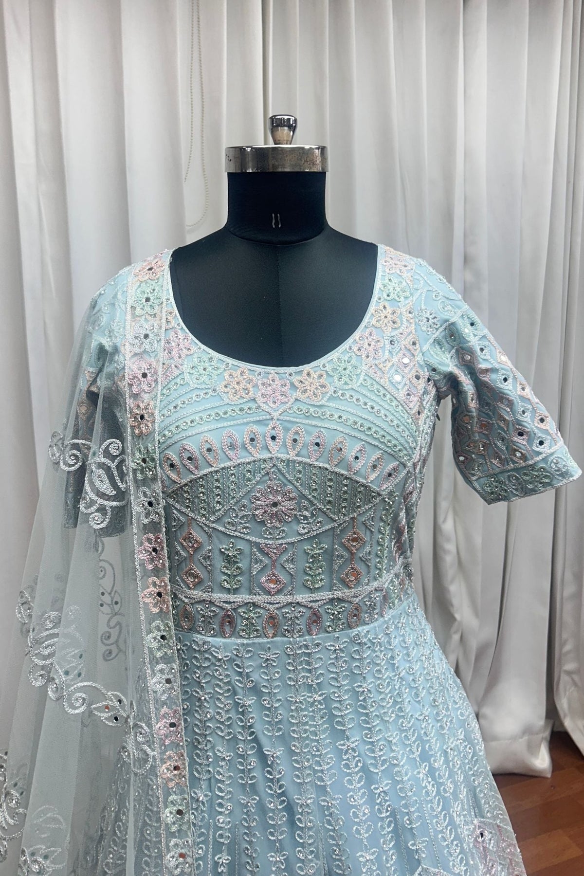 - A charming sky blue gown that sparkles with thread embroidery and zarkan with mirror work.
