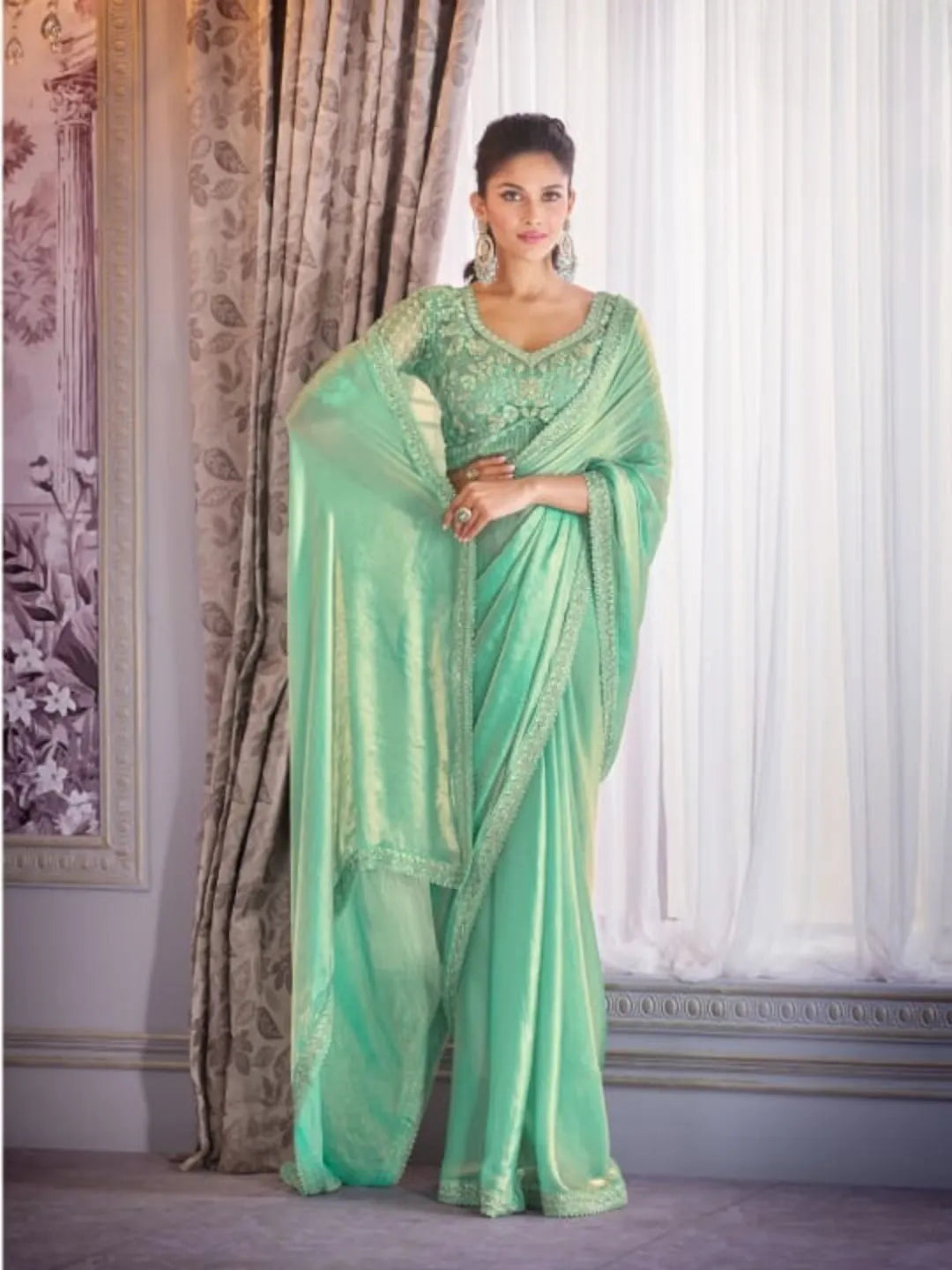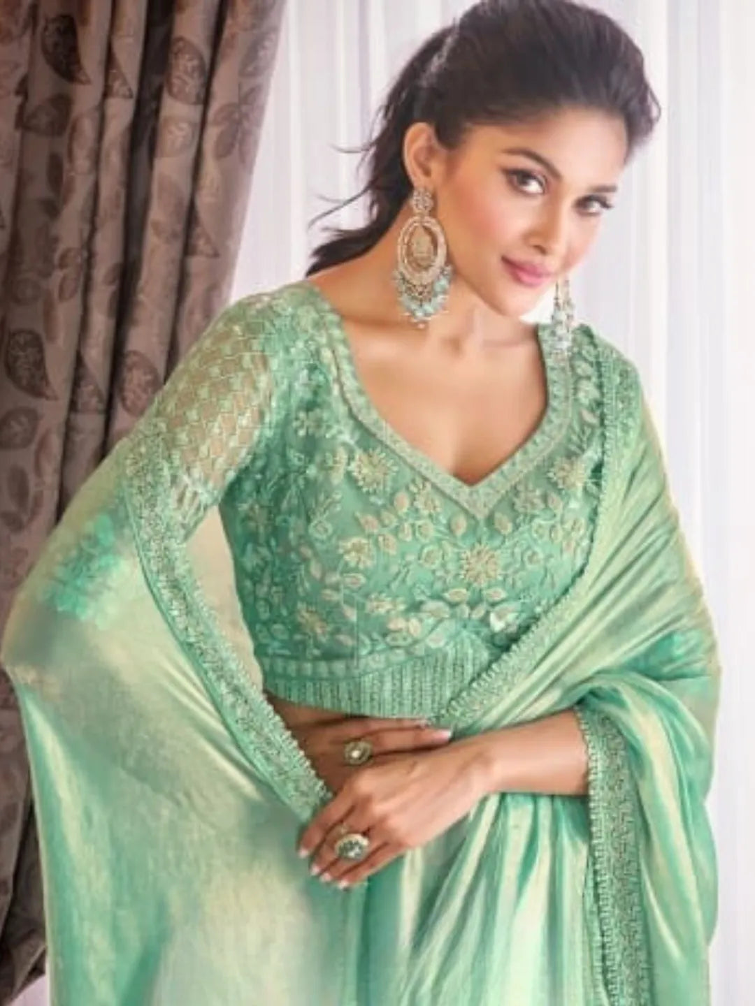 Stunning Shiny Pista Green Satin Organza Embroidered Saree