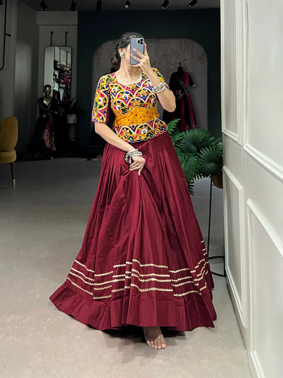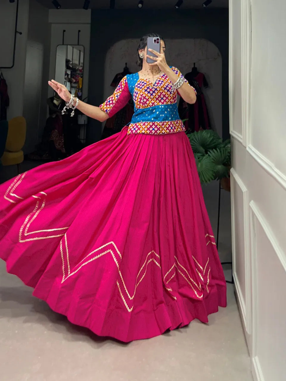 This Vibrant and Modern Cotton Lehenga Choli features a pure cotton lehenga with delicate Gota Patti detailing, paired with a stylish blouse made of Tussar Silk and Pure Cotton. The blouse showcases a beautiful Bandhej print and Kuchhi work, also adorned with Gota Patti for an elegant touch. Elevate your ethnic wardrobe with this exquisite piece.