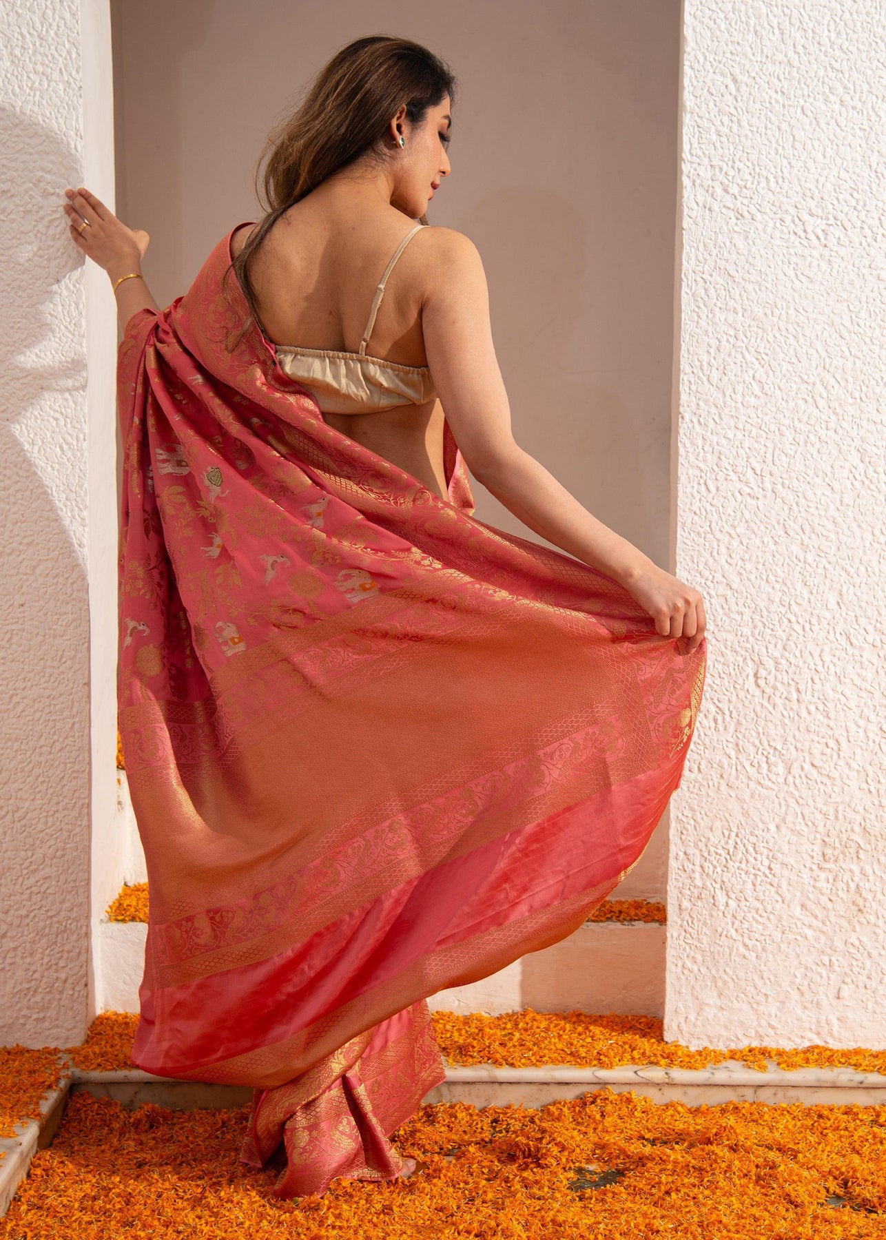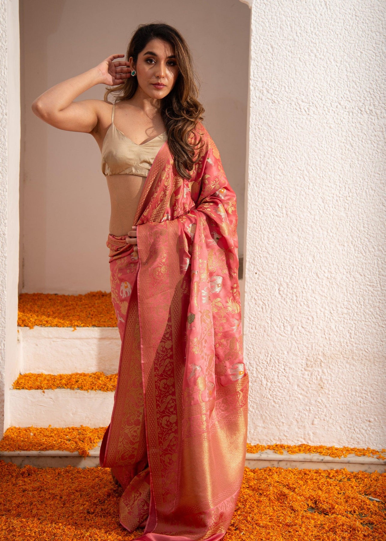 Shikargah: Banarasi Satin Silk Saree with Meenakari Motifs in the Shade of Pink
