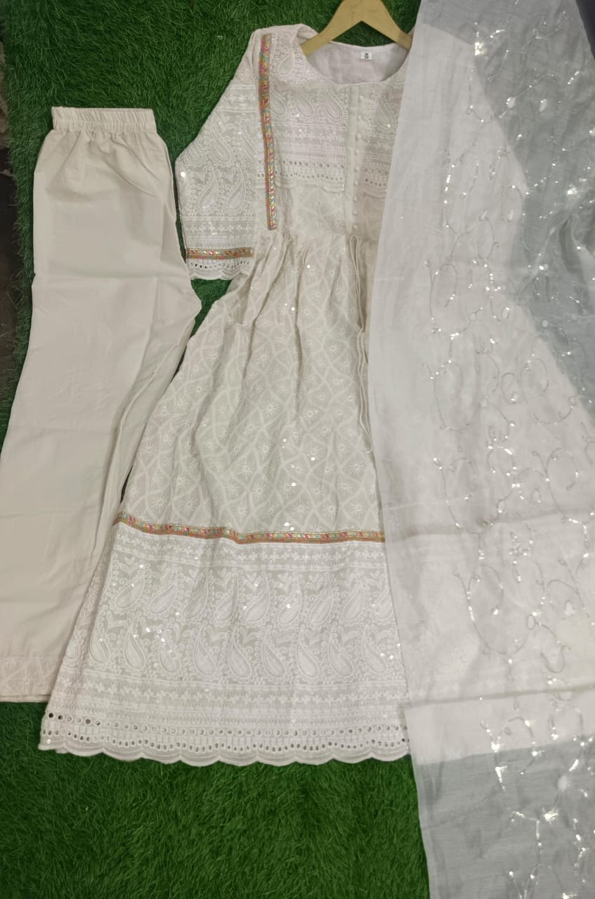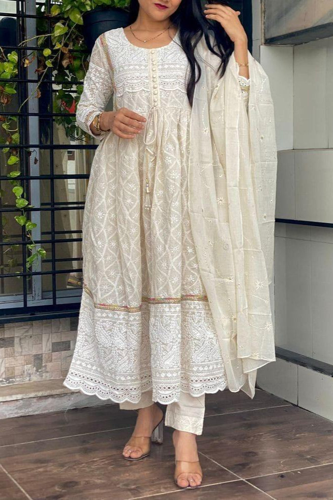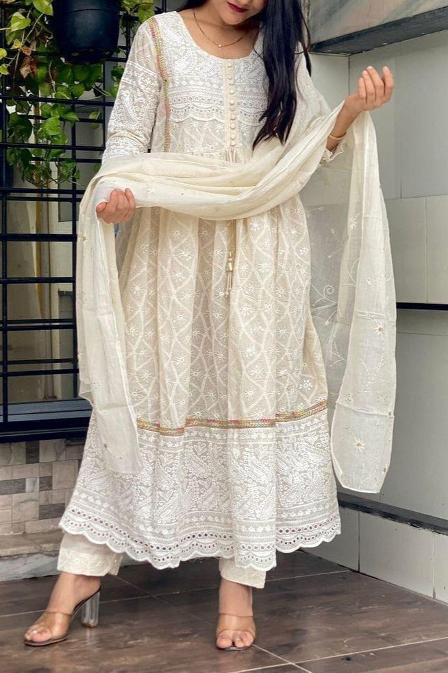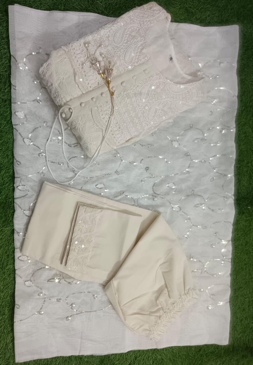 White Chikankari Suit Set with Sequin-Embroidered Chanderi Dupatta