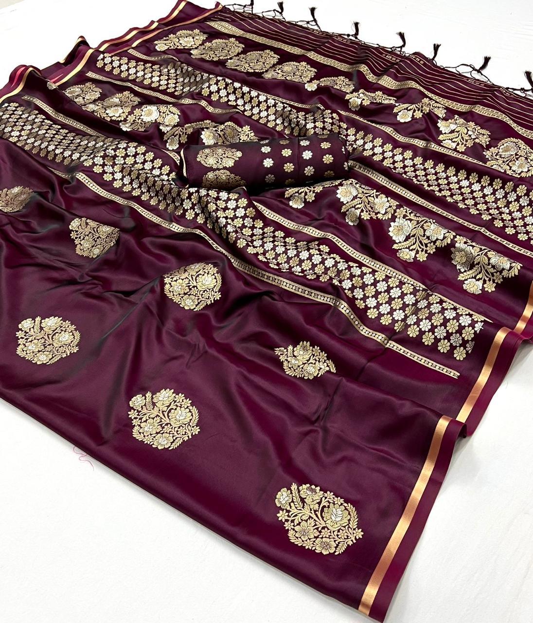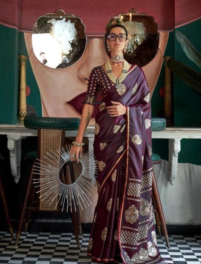 WIne Designer Pure Satin Weaving Silk Event Wear Saree