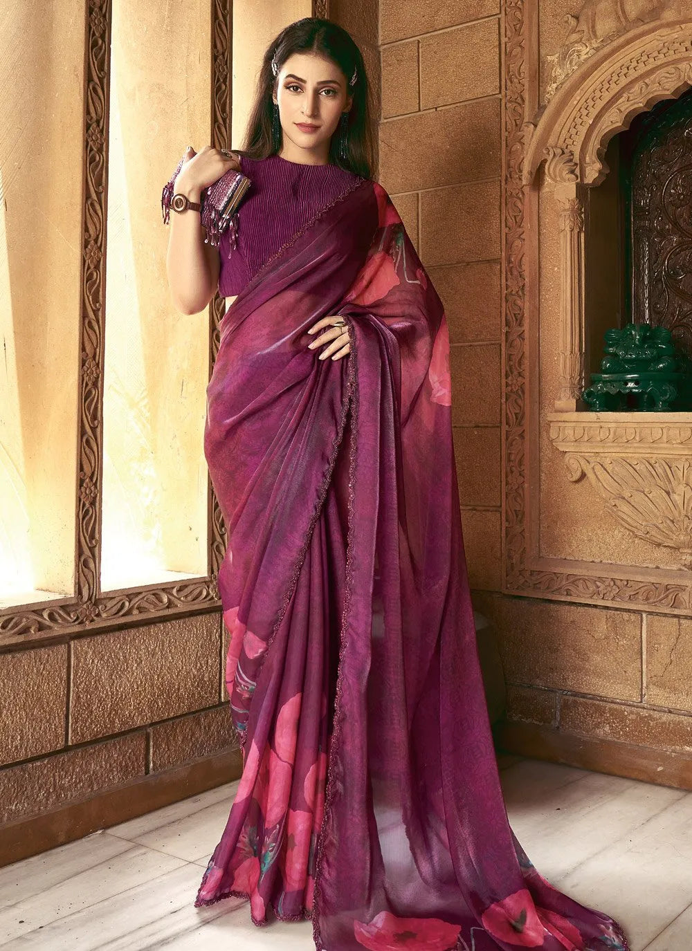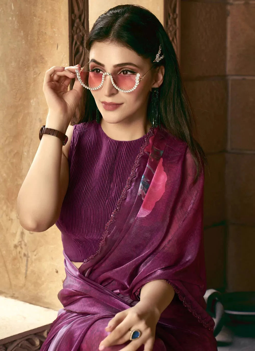 Wine Satin Silk Printed Thread Worked Designer Saree