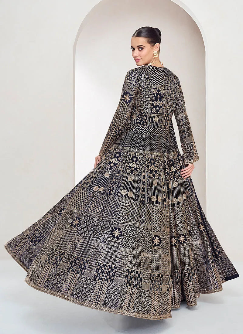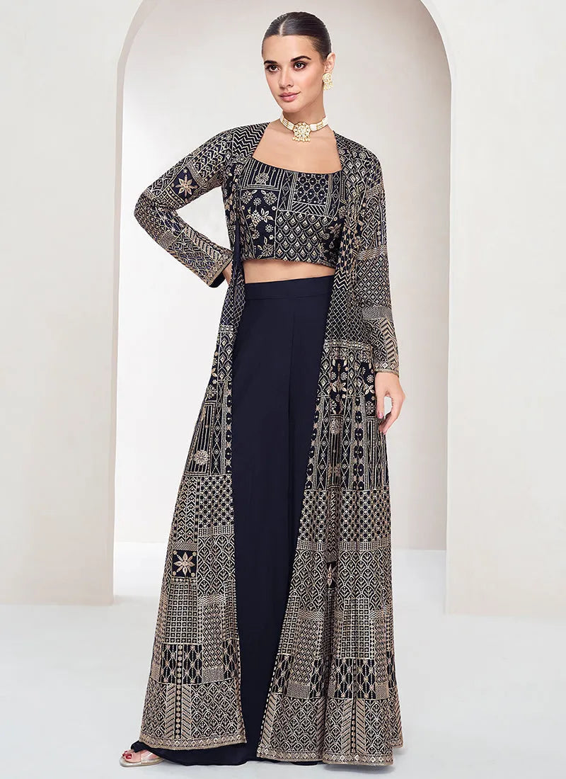 Designer Navy Blue Embroidered Jacket Style Palazzo Suit