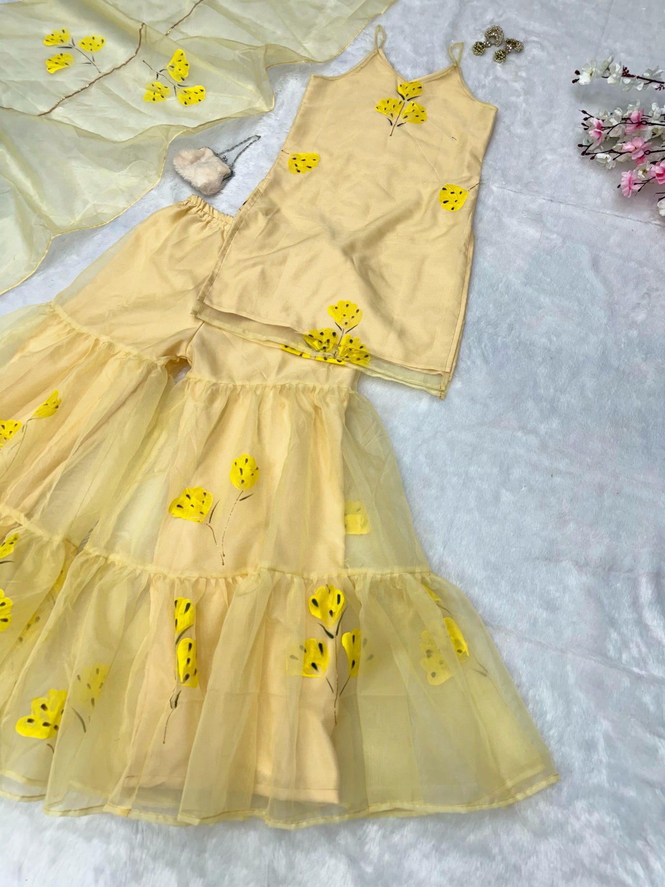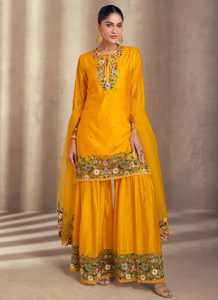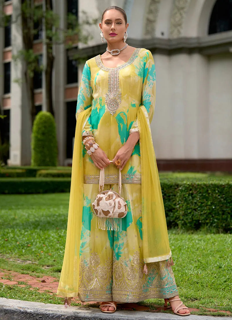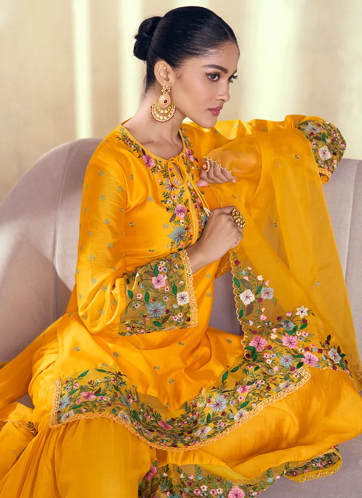 Designer Organza Yellow Color Sharara Suit