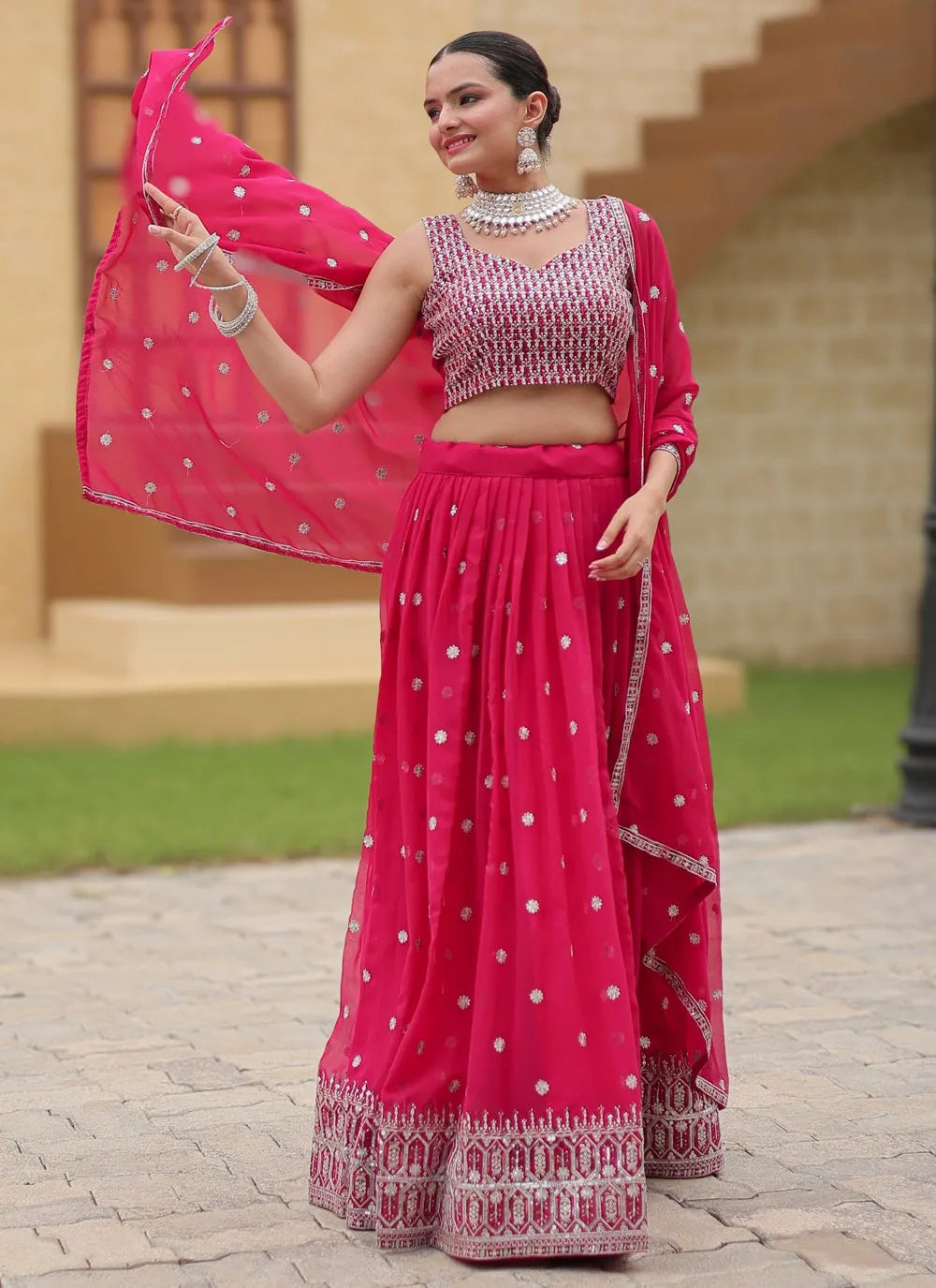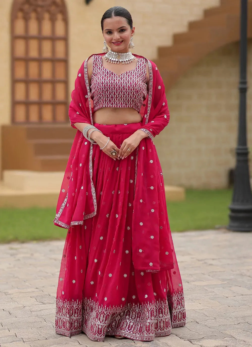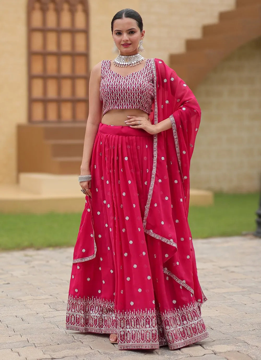 To complete the look, the accompanying dupatta is also made from heavy faux georgette, offering an elegant drape that enhances the overall appearance.