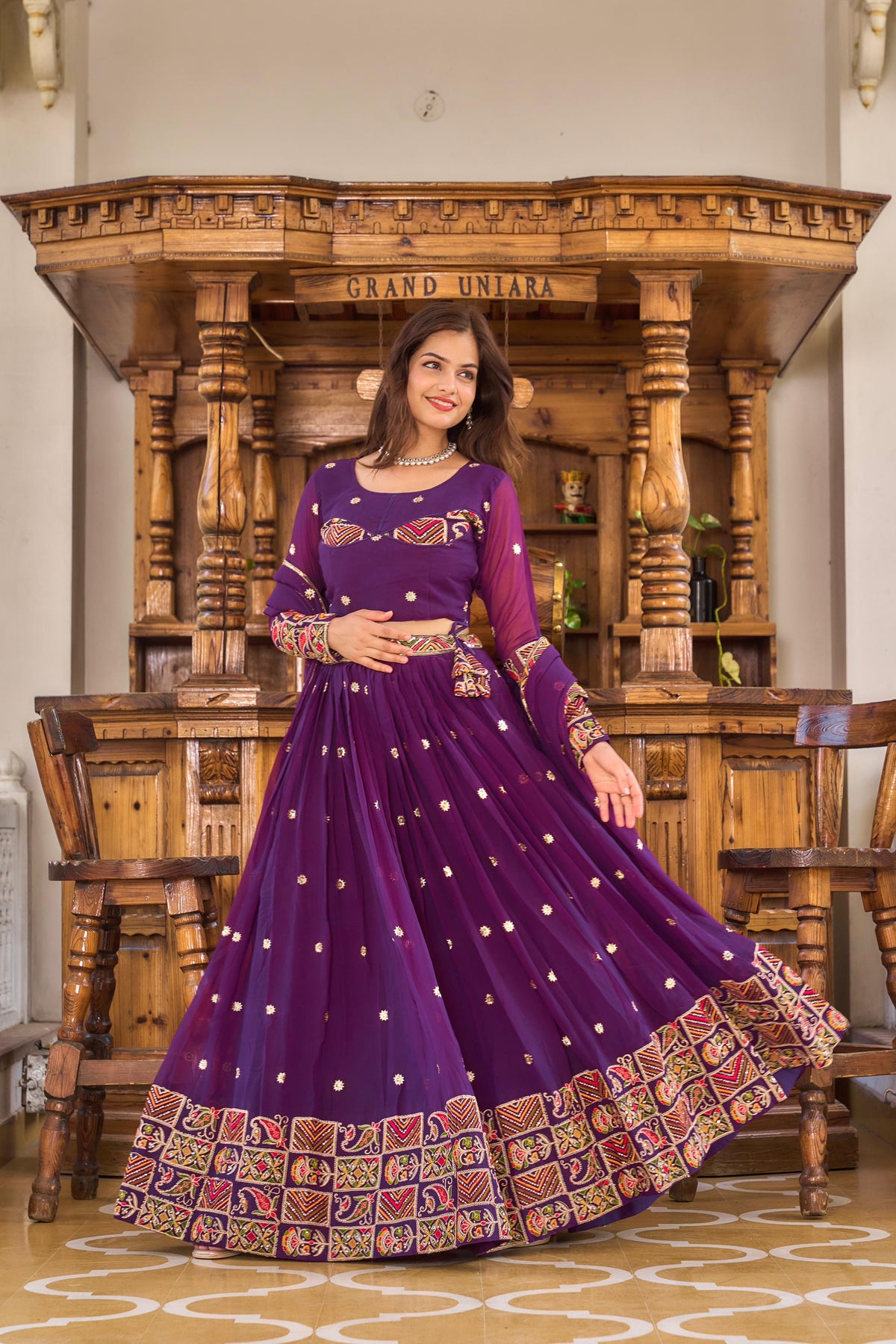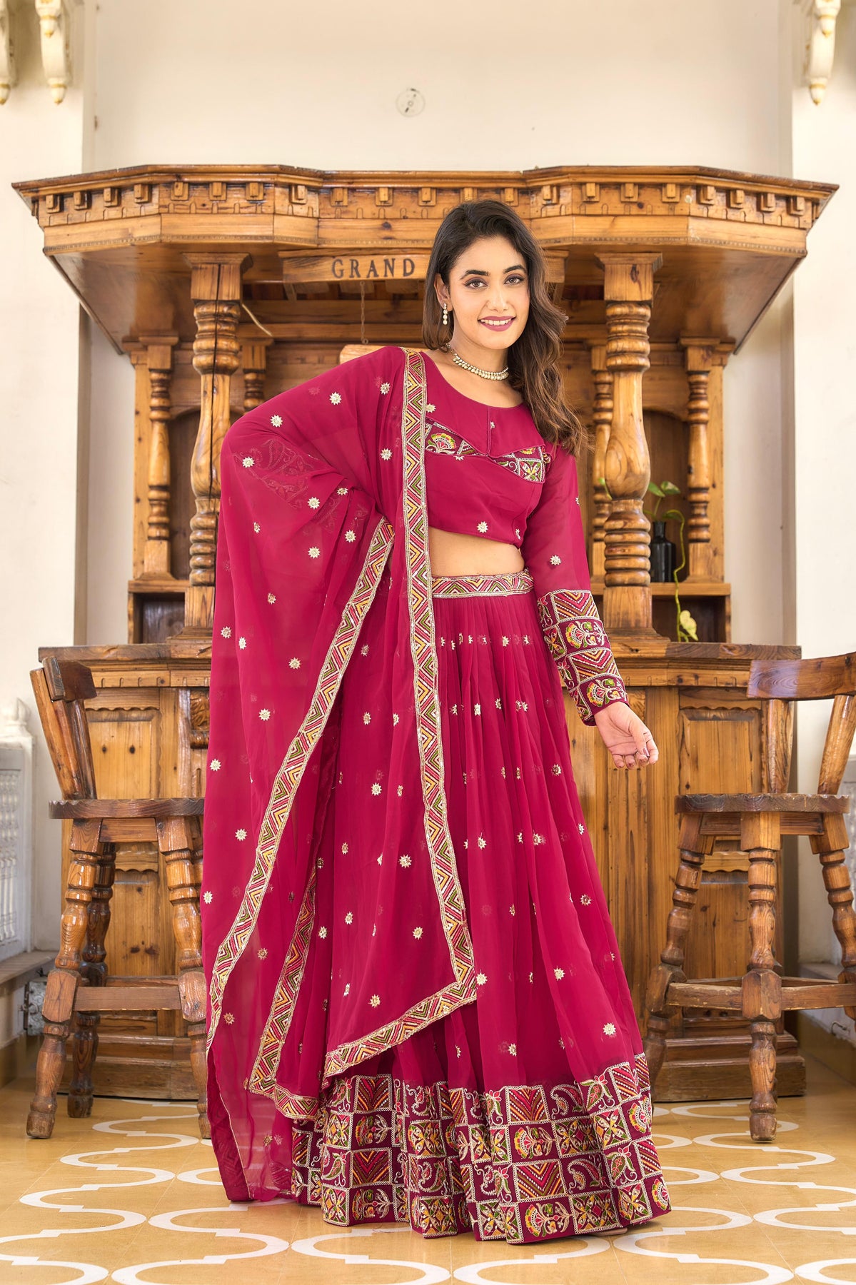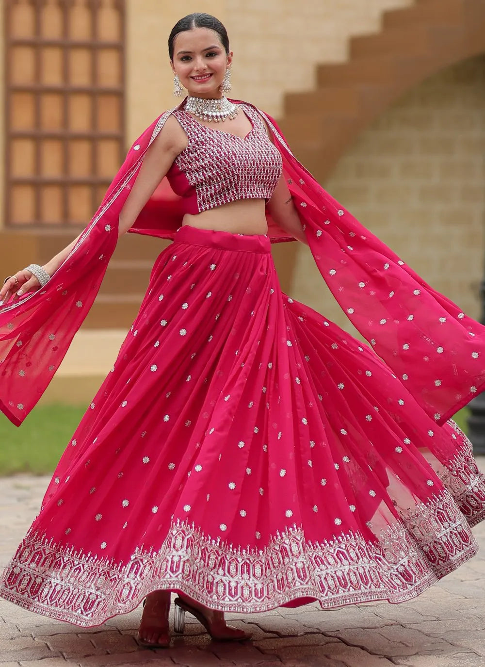To complete the look, the accompanying dupatta is also made from heavy faux georgette, offering an elegant drape that enhances the overall appearance.