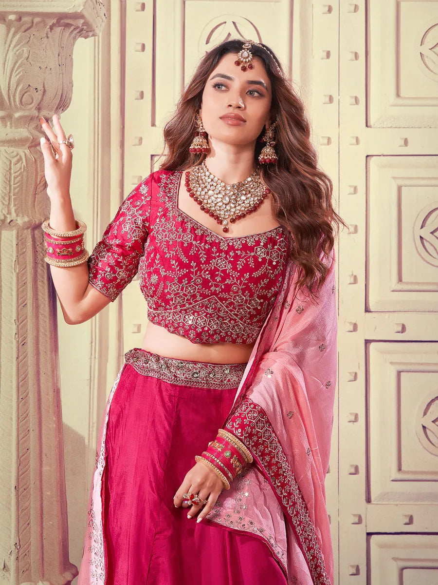 Designer Wine Embroidered Organza Silk Lehenga Set with Crop Top