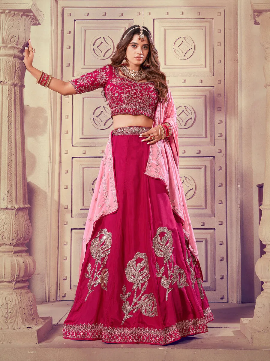 Elevate your bridal look with our Designer Wine Embroidered Bridal Lehenga choli Set. Made with high-quality Viscos Upada Silk, this set features intricate sequins and embroidered work, giving it a touch of elegance. The lightweight Viscos Chinon dupatta adds a charming drape that completes the perfect bridal ensemble. Perfect for a truly unforgettable wedding day.