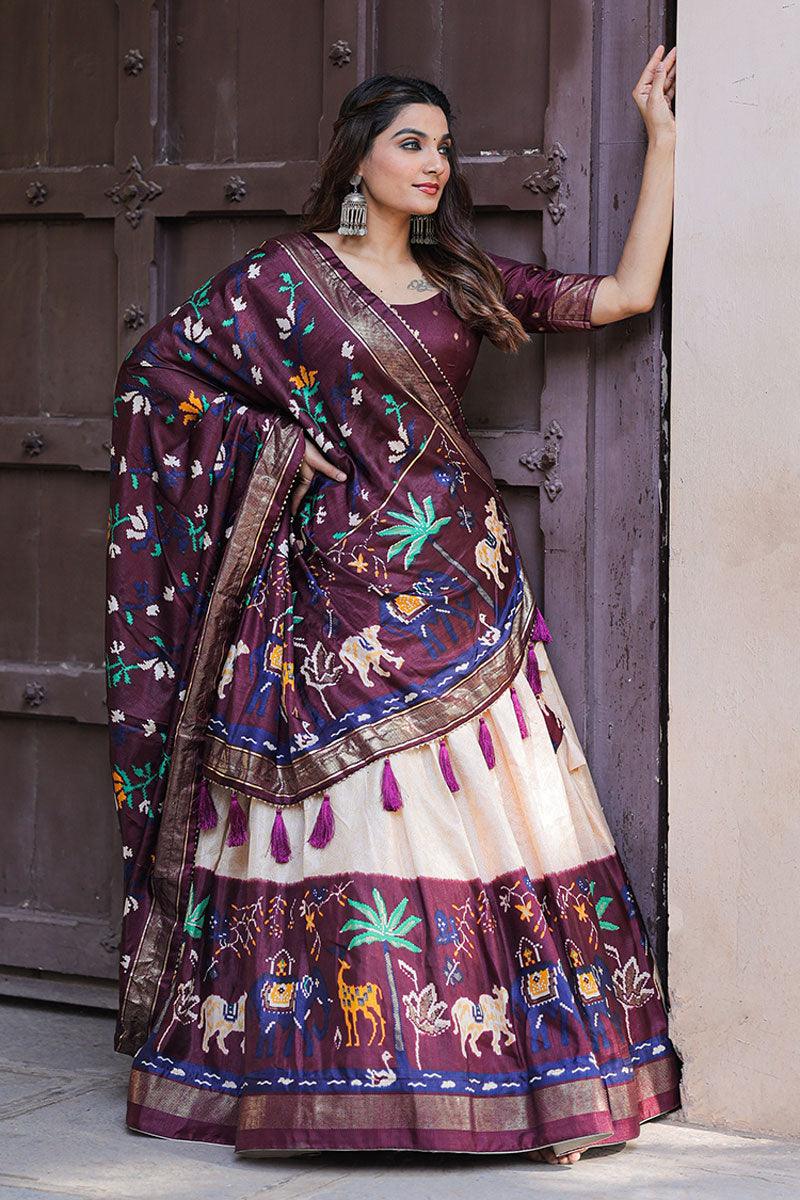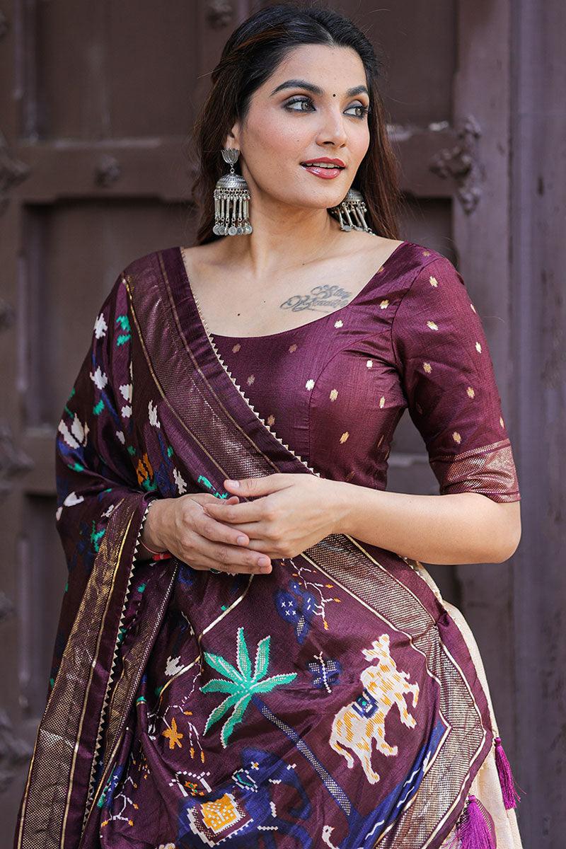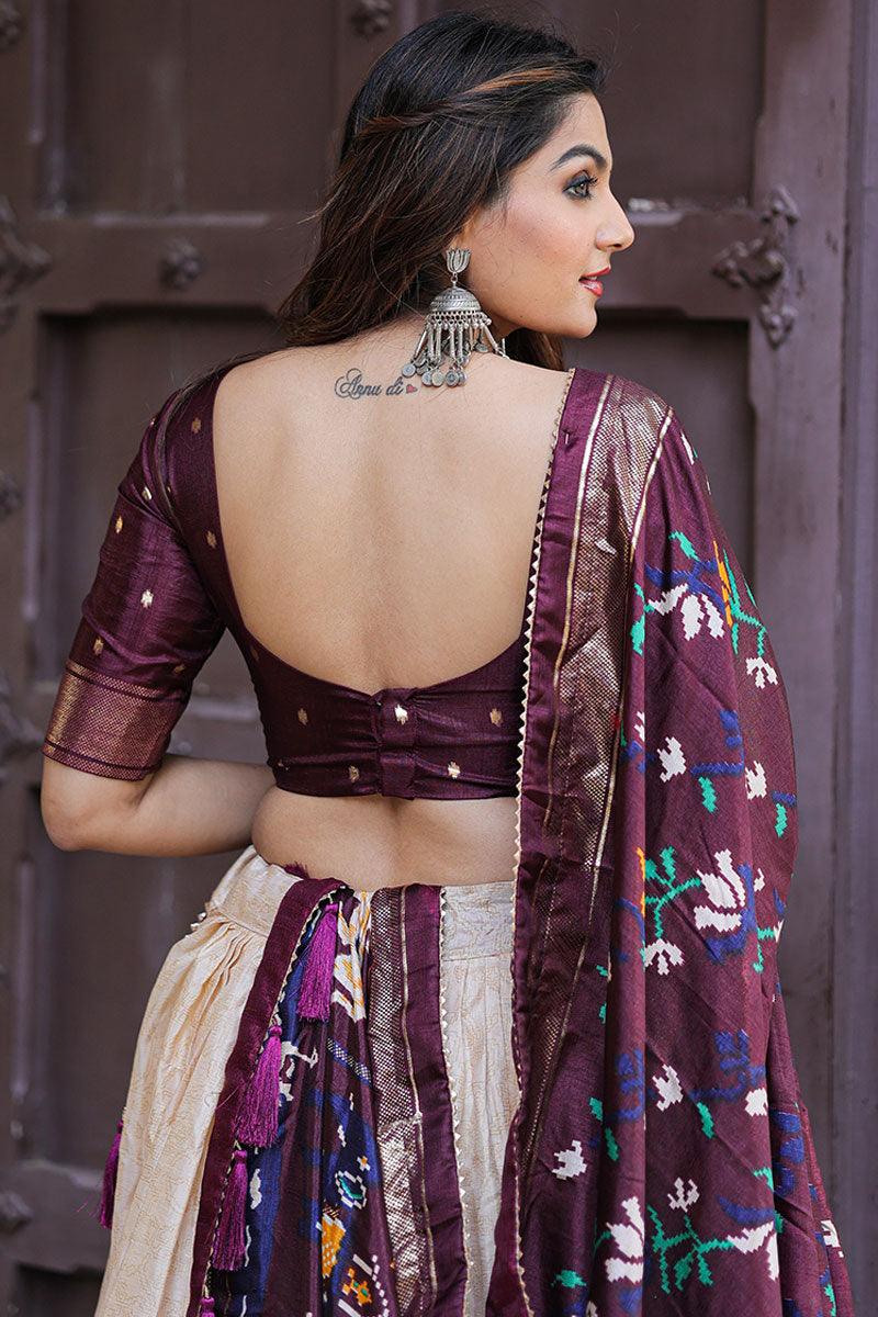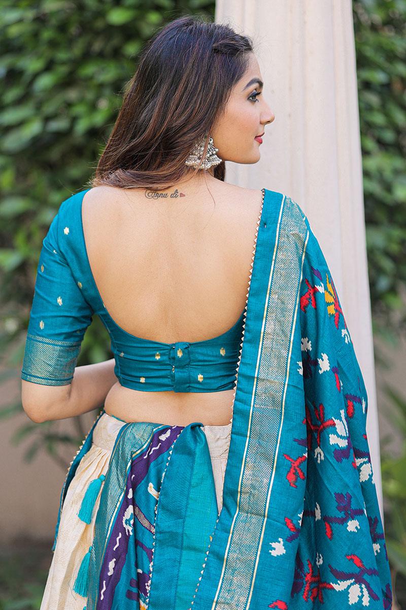 The saree comes with its own blouse piece. The model is wearing a separate blouse for styling purposes.