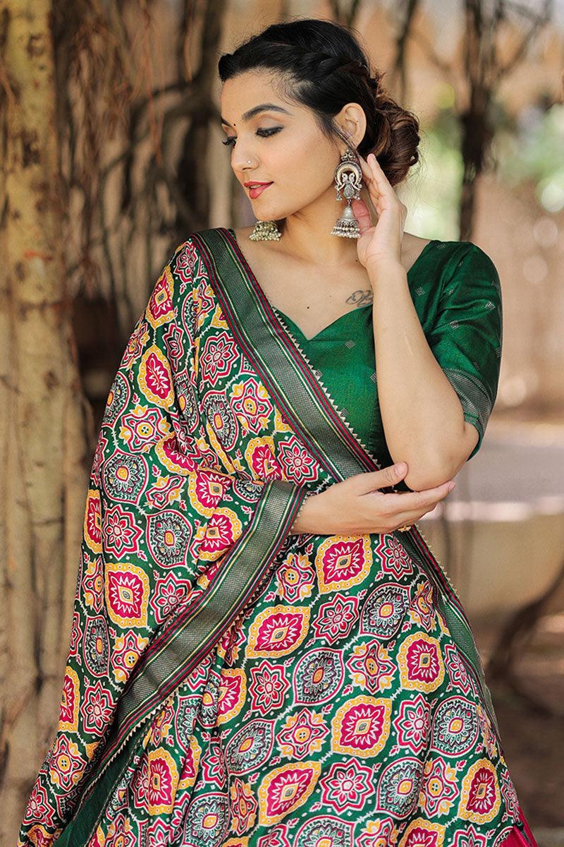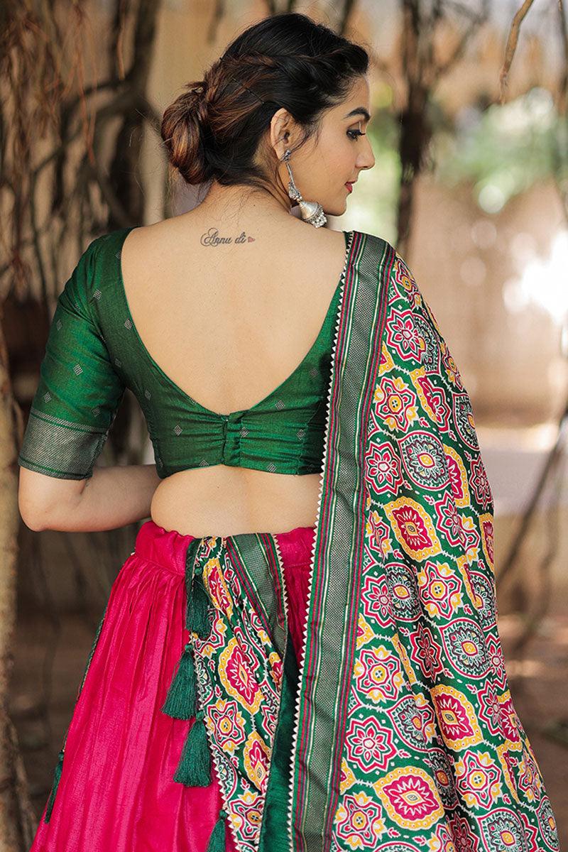 WHO WOULDN'T BE LURED BY THIS SAREE'S MANY CHARMS! THIS DESIGN HAS BEEN A CLASSIC ONE SINCE DECADES, ADORNED WITH INTRICATE AND GLORIOUS AMALGAMATION OF ZARI JAAL WITH BANDHANI . THE BORDER SHOWCASES MAGNIFICENT FLORAL MOTIFS, SYMBOLISING THE FLOWERS OF SPRING WHICH BRING POSITIVITY AND HAPPINESS IN ONE'S LIFE.