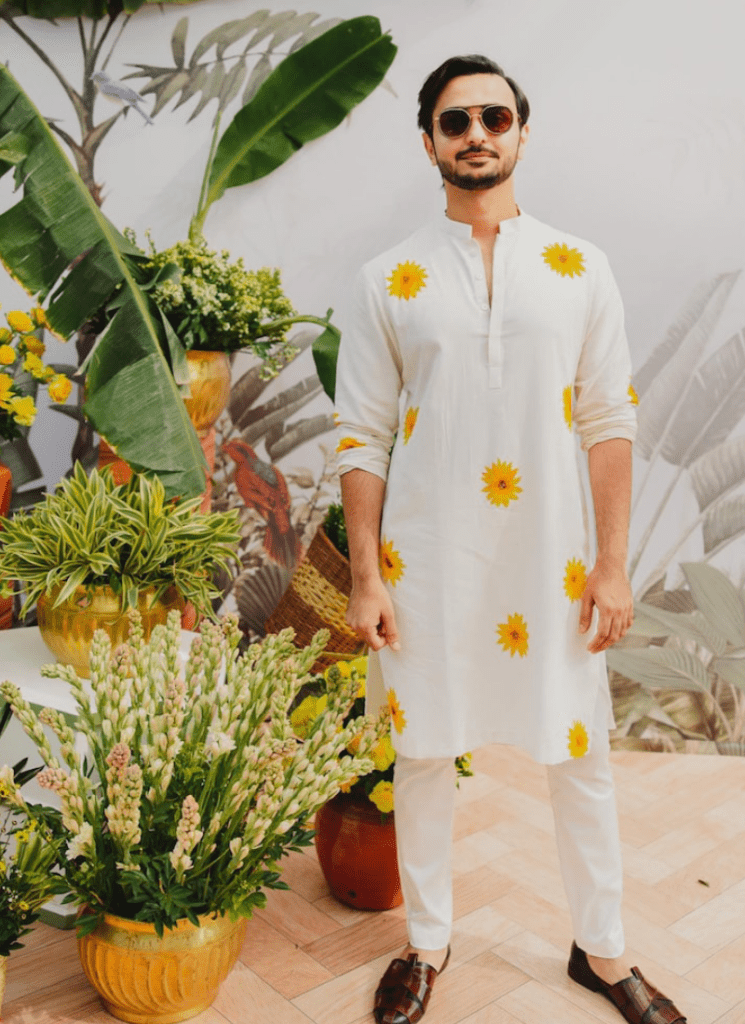 Floral Printed Georgette White Haldi Special Mens Kurta