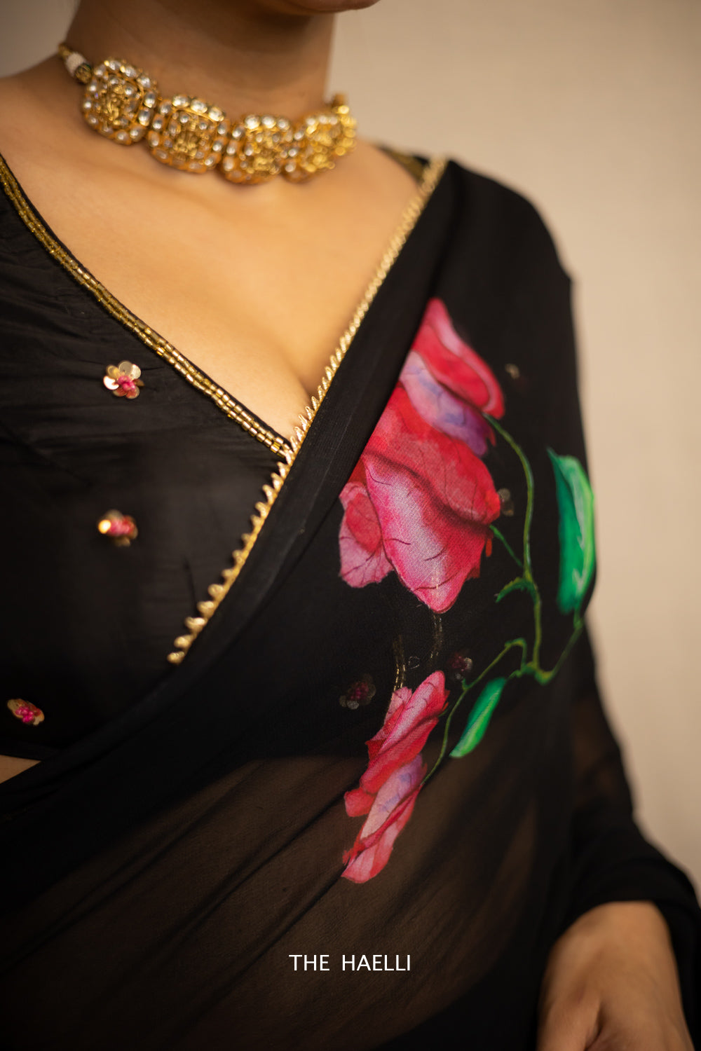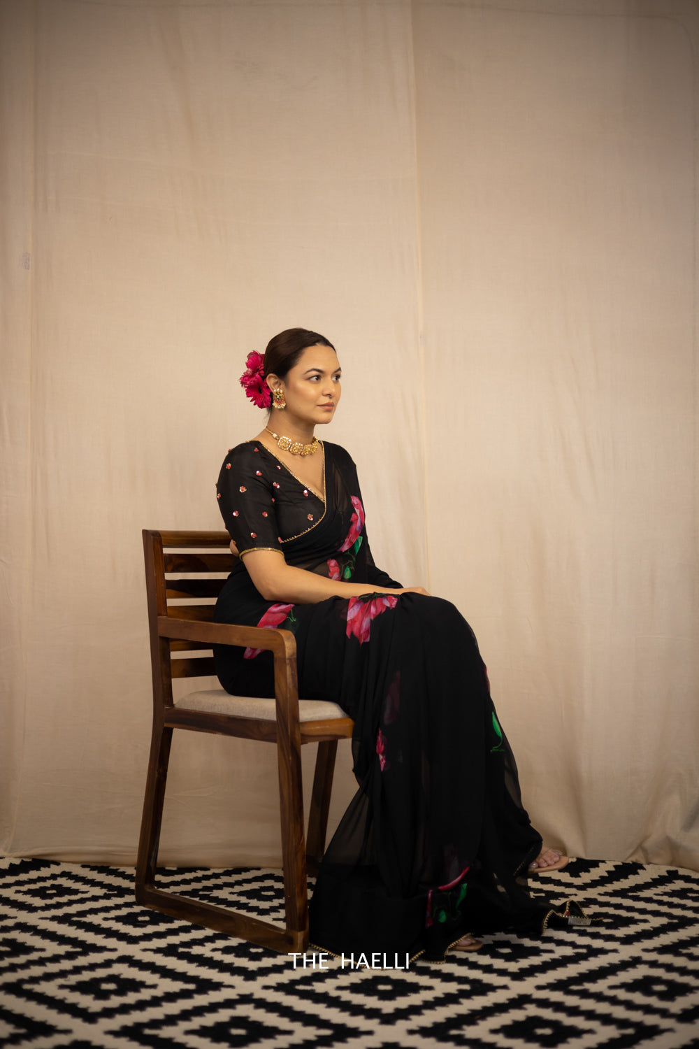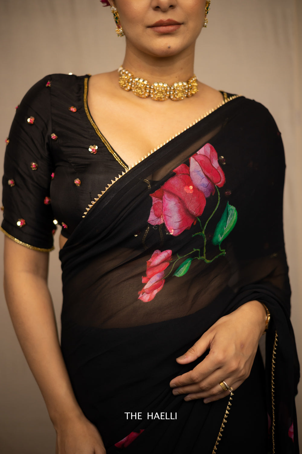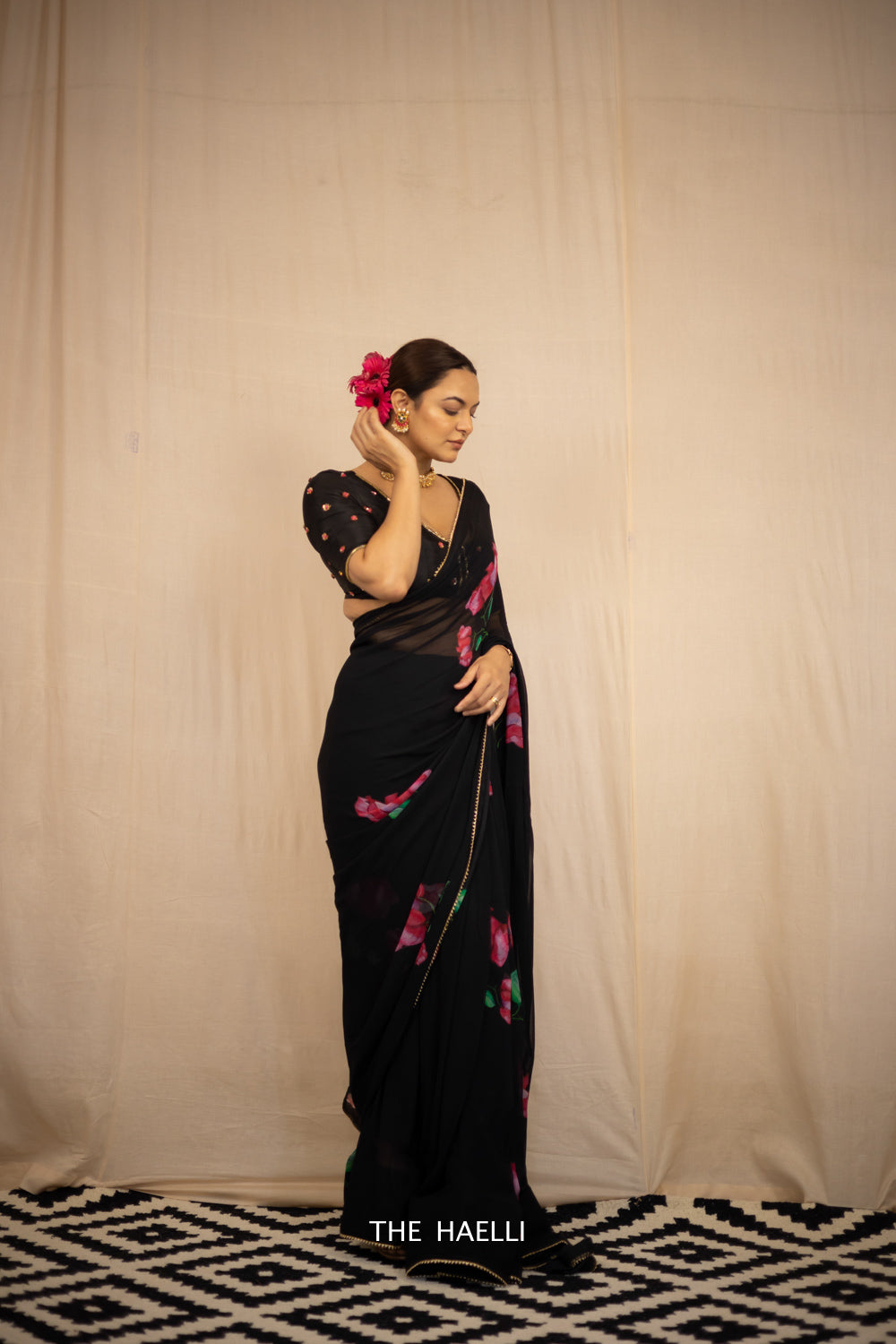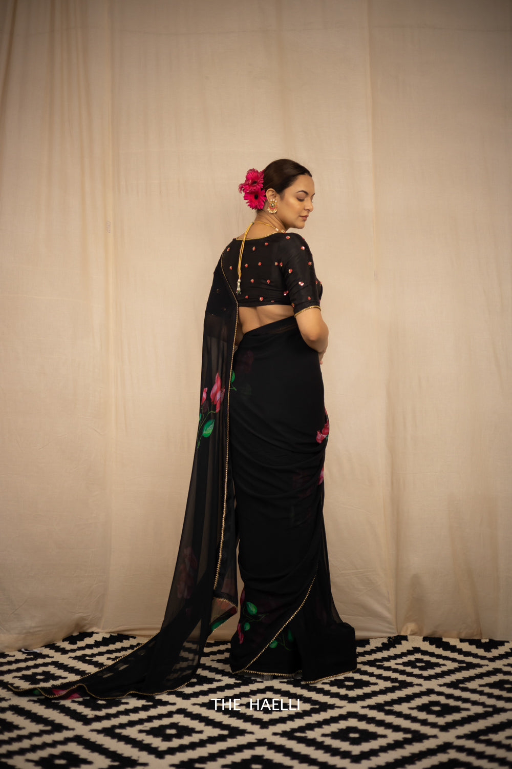 A stunner statement georgette saree with printed bougainvillea, and added gota border. Can be styled with embroidered blouse for a reception look or a casual chic blouse for day brunch.