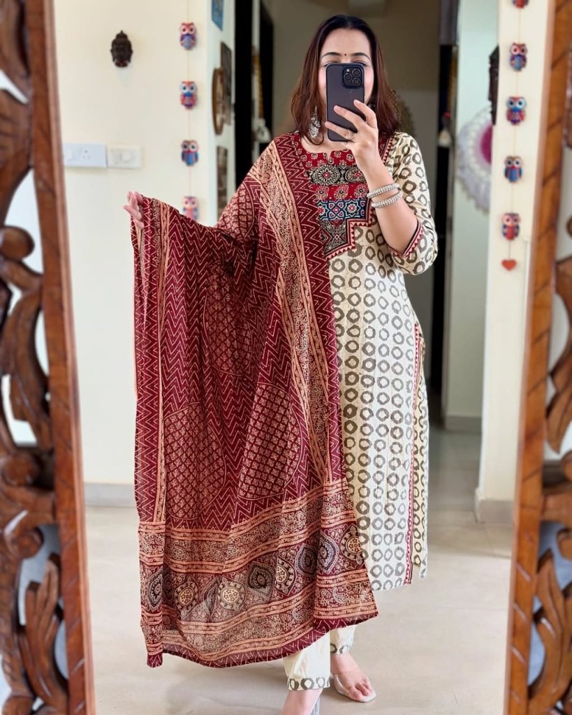 Featuring Fully Elegant Premium Muslin Suit Set Which is Beautifully Decorated With Hand Khatli Work And Original Mirror Work With Butti Pattern. It Is Paired With Matching Pants And Printed Dupatta