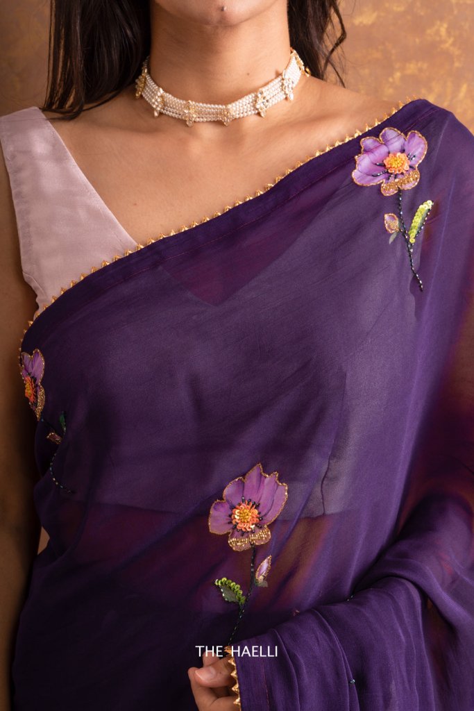 Printed floral motifs over georgette saree enhanced through cut-dana, siatara, zari and beaded hand embroidery