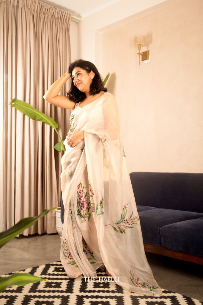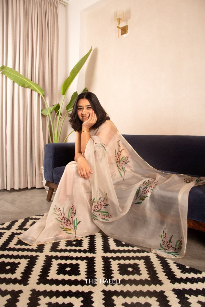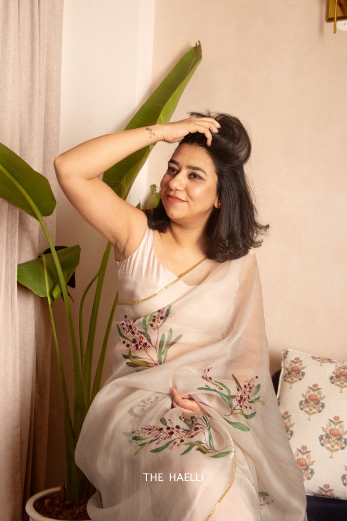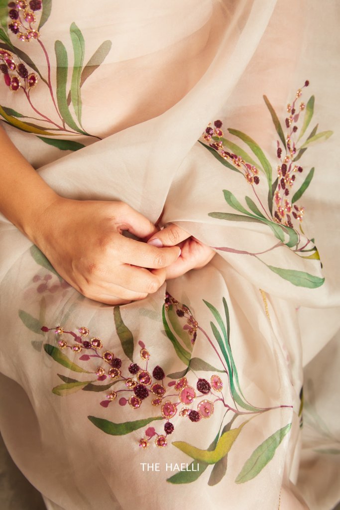 Sarees which feel so light and comfortable, along with beauty and grace are a must have in your wardrobe. This pure organza silk saree is printed with floral motifs highlighted through hand-emboidered beads and sitara with a defining cut dana border at the edges.