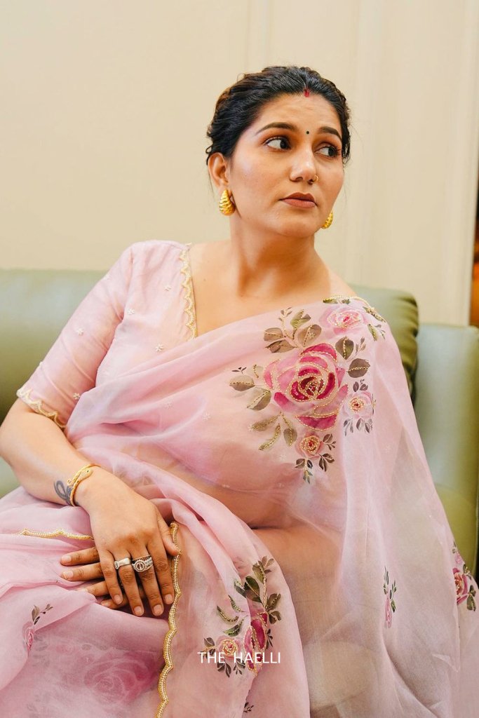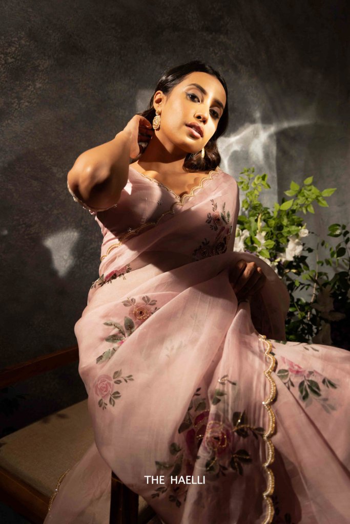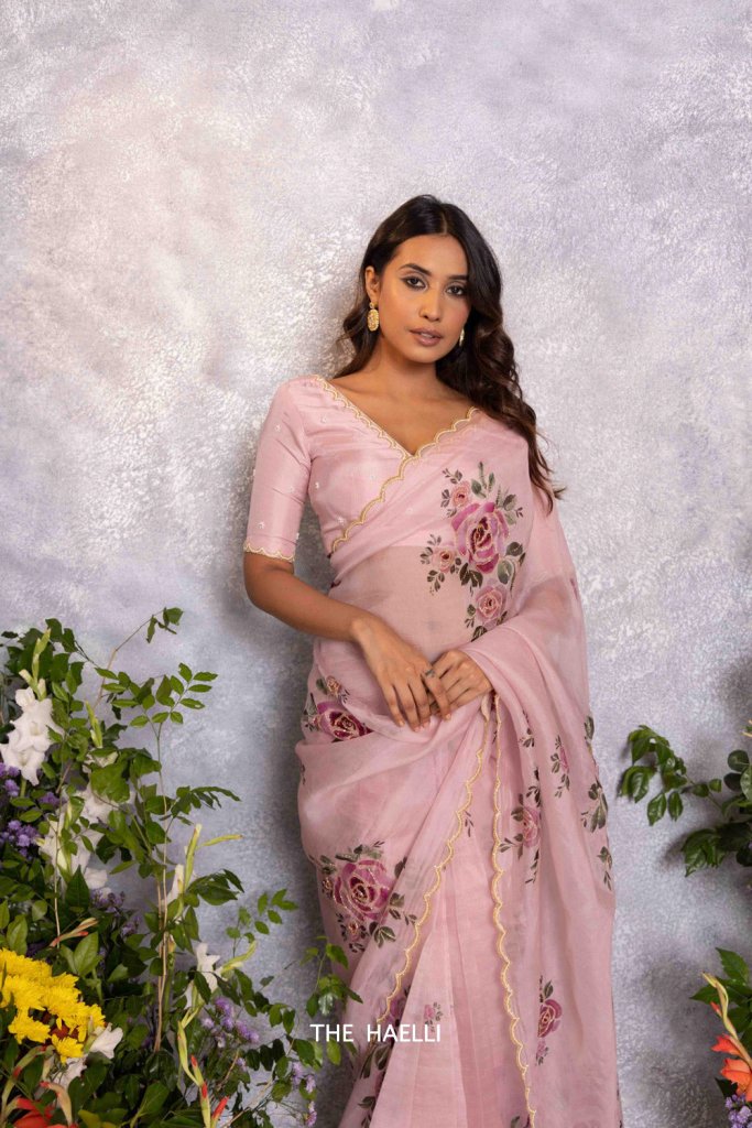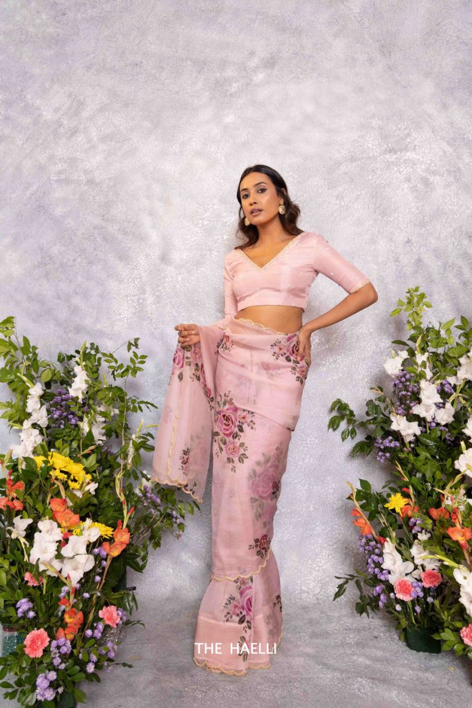 A regal piece with printed rose motifs highlighted with hand-embroidered cut dana, sitara and zari on pure organza silk saree. And a beautiful and delicate scallop hand-embroidered border.